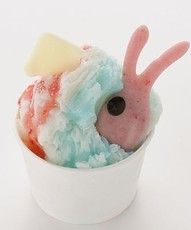 "Ika-chan Please Eat This By Yourself." (shrimp made of chocolate with a shaved ice topping)