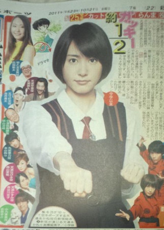 The Nikkan Sports newspaper published a picture of the cast in costume for the live-action television special inspired by Rumiko Takahashi's Ranma ½ martial arts comedy manga on Thursday. As a revival of the manga, the special tells an original story centering around Akane Tendō (played by Yui Aragaki). Kenta Kaku and Natsuna play the dual male/female roles of the title character.