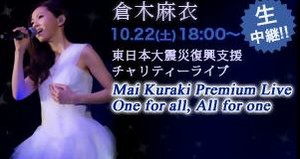 The Ustream website will stream the "Great Eastern Japan Earthquake Reconstruction Aid Charity Live Mai Kuraki Premium Live One for all, All for one" charity concert by singer Mai Kuraki live on Saturday, October 22 at 6:00 p.m. in Japan (5:00 a.m. EDT). The live event will also be streamed on YouTube, Nico Nico Douga, GyaO!, and au Exclusive Live websites. The concert is taking place at the Budokan concert hall in Tokyo.