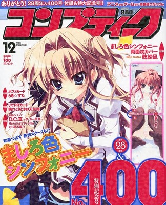 The December issue of Kadokawa Group Publishing's Comptiq magazine indicates that the issue will reveal a new work from Tsubasu Izumi, the illustrator known for her work on Mashiro-Iro Symphony - The color of lovers Akane Iro ni Somaru Saka, and other adult computer games. The 400th issue of the 28-year-old game and manga magazine will also cover Mashiro-Iro Symphony, which inspired the ongoing television anime series, on Thursday.