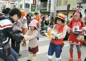 Approximately 20 members of the Japanese non-profit organization Grand 12 handed out mikan (mandarin oranges) on the streets of Kumamoto in Kumamoto Prefecture on Saturday while cosplaying as characters from Eiichiro Oda's One Piece manga. Kumamoto is Oda's hometown.
