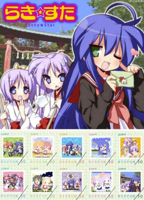 The Japanese postal service announced last Friday that a temporary branch office will issue Lucky Star postage stamp sets on New Year's Eve at Washinomiya Shrine. The shrine is the Tokyo area's oldest and a real-life backdrop for the Lucky Star anime and manga series.