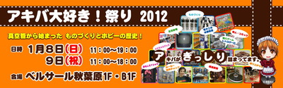 About 50 otaku shops will hold the "Akiba Daisuki! Matsuri 2012" (We Love Akiba! Festival 2012) event in Tokyo's Akihabara shopping district next Sunday and Monday (Japan's Coming of Age holiday). The Belle Salle Akihabara event hall will host the event.