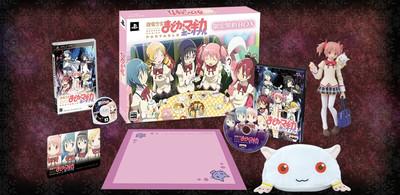 The "Limited Contract Box" edition of the game will contain a figma figure set of Madoka Kaname in her school uniform, a Blu-ray Disc with "special footage," a Kyubey-shaped pouch, a Homu-Homu handkerchief, a special clear card, a SHAFT-illustrated box, and the game UMD itself with an exclusive picture label. People who pre-order the game will receive a clip of actual film from the new transformation sequences, as well as a serial code for a custom PSP theme set.