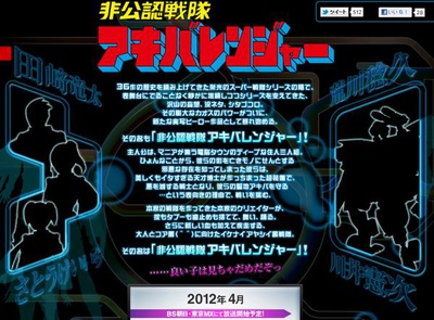 The Japanese production company Toei launched a website to announce that its live-action Hikōnin Sentai Akibaranger (Unofficial Sentai Akihabara Rangers) television series will premiere this April. The story follows three protagonists who live in Akihabara's Electric Town among other otaku. When the trio learn that a malevolent entity plans to annihilate their neighborhood, they become warriors to wipe out evil — with the help of super gear created by a beautiful and brilliant genius.