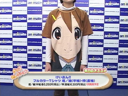 On Saturday night, the Anibun television program showcased the "K-ON!! Full-Color T-Shirts" that MOVIC will be selling at Animate stores this month. The entire front of each shirt, including the sleeves, is covered with a larger-than-life face of one of the anime's high school band members. The short-sleeved shirts come in Japanese sizes L and LL for 5,250 yen (about US$68) for each character — except for Azusa. Azusa's 6,300-yen (US$82) shirt comes with long sleeves to match her hair.