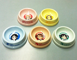 Canime.jp, the online shop of the production company Pony Canyon, began selling the official K-ON! pet food bowls in Japan this month. Each of the five small (12 by 4 centimeters or about 5 by 1.6 inches) ceramic bowls features a face of one Ho-Kago Tea Time high school band member at the bottom, while the medium-sized bowl (16 by 6 centimeters/6 by 2.4 inches) has all five faces. The small and medium ceramic bowls each cost 1,500 yen (US$19.50) and 2,000 yen (US$26), respectively.
