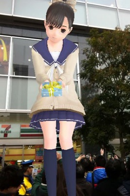 To celebrate the Valentine's Day release of Konami's New LovePlus virtual girlfriend simulator, 7-Eleven's Akihabara Center Place convenience store branch placed giant augmented-reality (AR) markers on its front windows. When viewed from the camera of a Nintendo 3DS or a compatible smartphone, a 7.11-meter-tall (about 23-foot-tall) girl from New LovePlus appears. One of three different super-sized girlfriends extends her hands to offer chocolates, in the tradition of Valentine's Day in Japan. The giant AR markers will stay up until Sunday.