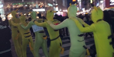 A pack dressed in stretchy Pikachu attire was spotted at a number of Tokyo neighborhoods this past weekend. The Pikachus — at least six of them with one cosplayer as Pokémon's Satoshi/Ash in tow — were reported not only in Shibuya and Harajuku in eastern central Tokyo, but also in Hamamatsuchō further west. (The group was sighted grazing at a McDonald's restaurant in Harajuku, wandering through a Starbucks Coffee shop in Shibuya, and riding the busy Yamanote train line.)