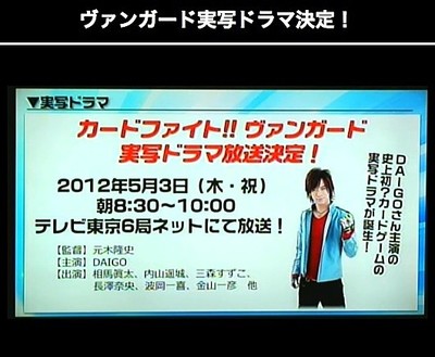 The Japanese game maker Bushiroad announced during its streamed Vanguard Special Conference on Tuesday that a live-action television adaptation of its Cardfight!! Vanguard trading card game has been green-lit. BREAKERZ band musician DAIGO will star in this project, which will air on May 3, Japan's Constiution Memorial Day, from 8:30 to 10:00 a.m. Takashi Motoki (Mōsō Deka!) is directing this project, which is described as the "first(?) ever live-action card-game" program.