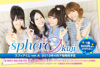 People who want the prizes must buy 500-yen (about US$6) tickets and hope they win their desired item. The lineup of prizes for the "ver. A" lottery has been announced, with the lineup for the late-May "ver. B" lottery yet to be announced. Sphere consists of the voice actresses Minako Kotobuki, Ayahi Takagaki, Haruka Tomatsu, and Aki Toyosaki.