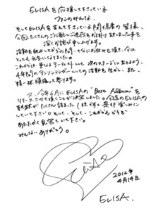 Singer ELISA announced in a letter on her website Saturday that she is reentering the music world with a compilation CD. Rainbow Pulsation -The Best of ELISA- goes on sale on June 20. A track listing for the CD will be announced in the future.