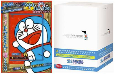 The Japanese publisher Shogakukan announced on Monday that it is recalling Doraemon TV Series Masterpiece Collection DVD: Yume no Machi Nobita Land Version (pictured lower left) and Doraemon Time Machine Box 1979 (pictured lower right) DVD sets due to an "inappropriate word" appearing in the children's anime series. The word "condom" (コンドーム) appears onscreen for about two seconds in the "Isshou ni Ichi Do Ha Hyaku Ten o" episode of the second Doraemon television series in the sets.