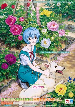 Neon Genesis Evangelion female lead Rei Ayanami appears in the Spring 2012 promotional poster for The National Federation of All Japan Guide Dog Training Institution's International Guide Dog Day, which is April 25. Hidenori Matsubara (Evangelion key animator and animation director, Ah! My Goddess/Sakura Wars character designer) drew Ayanami in her school uniform with Licht, a White Swiss Shepherd Dog who represents the 25,000 guide dogs in service throughout the world. ("Licht" is German for "light.")