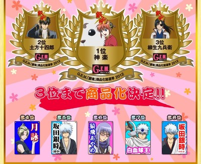 The Premium Bandai website revealed the final results for a poll that asked fans to choose their favorite Gintama characters in order to determine which to make figures of. 56 characters were split into four voting blocks, and the top two from each block went on to compete in the final round of voting. The results of the top eight are as follows: