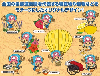 Post offices across Japan will begin selling One Piece-themed postage stamps starting on May 14. The Amada Printing Manufacturing Company created 47 stamps in all, one for each prefecture in Japan. Each of the stamps feature an original design of the One Piece character Tony Tony Chopper in his "New World" outfit accompanied by a specialty product or food from each prefecture.