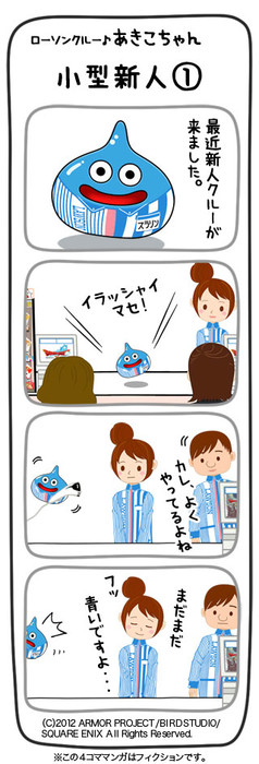 In the Lawson Crew Akiko-chan manga's "Kogata Shinjin" (Pint-Sized Hire) #1 strip, the latest crew member arrives. Slime impresses customers with his service ("Welcome!") and a fellow co-worker with his quick learning ("He's doing his job well, isn't he?"). Unimpressed, Akiko says, "He's still green [blue]…."