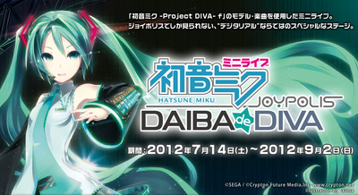 Starting this Saturday, the virtual Vocaloid idol Hatsune Miku will be holding mini concerts every day at the revamped Tokyo JOYPOLIS amusement park all this summer. The "Hatsune Miku Mini Live Daiba de Diva" concerts will feature the CG model and music from Sega's upcoming Hatsune Miku Project Diva F musical rhythm game.