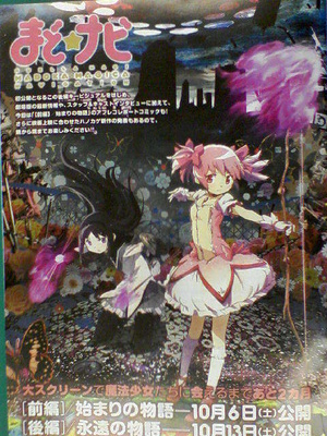 Producer Atsuhiro Iwakami had revealed last November that the film trilogy will begin with a two-part compilation of the original television series, followed by an all-new film. Gekijō-ban Mahō Shōjo Madoka Magica Zenpen: Hajimari no Monogatari (Puella Magi Madoka Magica the Movie Part I: The Beginning Story) will open on October 6 at Tokyo's Shinjuku Wald 9 and other theaters nationwide. Gekijō-ban Mahō Shōjo Madoka Magica Kōhen: Eien no Monogatari (Puella Magi Madoka Magica the Movie Part II: The Eternal Story) will follow on October 13.