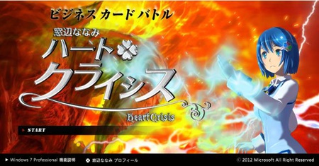 Microsoft's Smart Business Center has launched a browser mini-game titled "Heart Crisis" starring the Windows 7 mascot character Nanami Madobe. In the "business card battle" game, players use cards containing different attack moves for Nanami to defeat computer-related monster cards, such as a "wallpaper pretty" card that has replaced Nanami's wallpaper with a picture of her parents right before an important presentation.