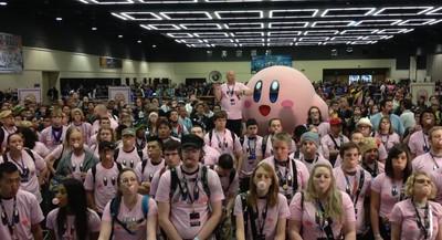 The official Twitter account for Nintendo America posted that 536 fans helped break the Guinness World Record for most simultaneous bubblegum bubbles. The standing record required over 304 people to attend. Fans in pink shirts crowded into Queue Room 4A in the Washington Convention Center at Penny Arcade Expo (PAX) to celebrate Kirby's 20th anniversary by blowing bubblegum bubbles.