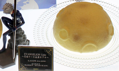 Premium Bandai, Bandai's official shopping website, is currently taking pre-orders on a new 'Moon's Surface and Kaworu Nagisa' cake. The cake will ship in mid-October. The sponge cake is filled with a mango mousse and mango sauce while the moon's "crust" is made of whipped white chocolate topped with coffee powder. The cake comes with an 11-centimeter (about 4-inch) tall Kaworu figure, pedestal, and the "Mark.6" spear. The entire set will be delivered in a freezer for 4,410 yen (about US$56) plus shipping.
