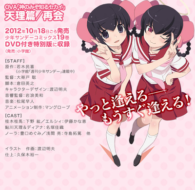 New cast members in the recently announced new anime installment adapting Tamiki Wakaki's The World God Only Knows (Kami Nomi zo Shiru Sekai) manga were announced on Wednesday. In the original video anime (OVA), Kaori Nazuka will voice Tenri Ayukawa and Diana, Takuma Terashima will voice Ryō ASAMA, and Megumi Toyoguchi will voice Nora.