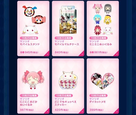 Original goods available during the campaign include tins, cases, banks, mini plushes (pictured above - top right), a Smiling Madoka plush (pictured above - bottom left), memo pads (pictured above - bottom right) note pads, lip balm, facial tissues, ice cream, a calendar, and a set of "anywhere" Kyubey eye stickers (pictured above - bottom center).