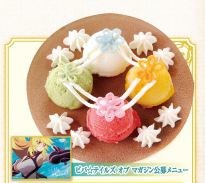 Each dish comes with a postcard with the corresponding character on it. The event celebrates the release of the Tales of Xillia 2 video game, which will ship on November 1. The event also features merchandise for the game and other Tales of games such as Tales of Vesperia, Tales of Symphonia, and Tales of Graces. Namja Town is also offering a lottery for goods, with prizes ranging from postcards and pins to cushions and tote bags.