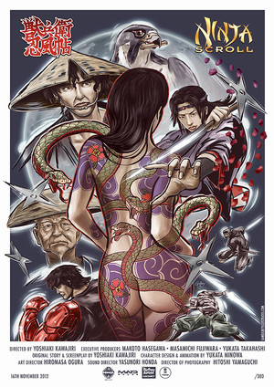 The British artist Sam Gilbey (profile) has posted the original artwork which he created to promote the anime action film Ninja Scroll. Posters featuring the artwork were given away at last week's Ninja Scroll screening at the Hackney Picturehouse cinema. Gilbey comments, "With this piece I wanted to try and capture the energy and feel of the classic anime, utilising loose flowing marks." He added that he wanted to reinterpret the characters, rather than copy the anime drawings.