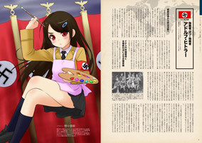 On Thursday, Ikaros Publications released Nyotai-ka! Sekai no Dokusaisha Retsuden (Transformed Into Females!! Biographies of World Dictators), a book that profiles about 70 real-life dictators and illustrates them as moe girls. For example, Nisieda draws China's Mao Zedong (with pumpkin pants), Super Zombie draws North Korea's Kim Il-sung (as an idol singer), Takeshi Nogami draws Iraq's Saddam Hussein, and Miki Nonohara draws Germany's Adolf Hitler.