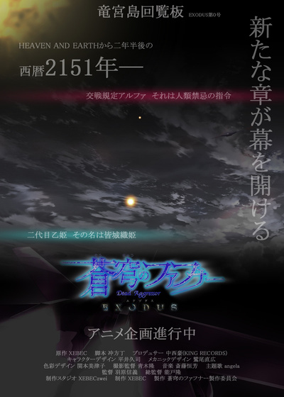 The anime studio XEBEC zwei opened a page for the upcoming Fafner sequel, Sōkyū no Fafner: Dead Agressor: Exodus, on Tuesday. The page reveals that the sequel is set in the year 2151, two and a half years after the film Sōkyū no Fafner: Dead Aggressor: Heaven and Earth. The website lists three taglines: "The curtain rises on a new chapter," "Rule of Engagement Alpha is the order to avoid contact with humanity," and "the name of the second-generation Tsubaki is Oriki Minashiro."