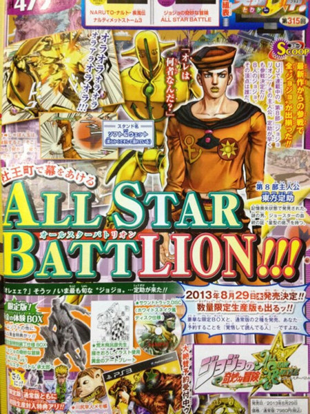 This year's 12th issue of Shueisha's Weekly Shonen Jump magazine is revealing on Monday that JoJolion (Jōsuke Higashikata), the lead character of JoJo's Bizarre Adventure's eighth manga part, will be a playable character in Namco Bandai Games' JoJo's Bizarre Adventure: All-Star Battle game. The issue also reveals that the game is scheduled for August 29, and that there will be a limited-number box with a soundtrack CD, a gold art plate illustrated by manga creator Hirohiko Araki, and figures. The first copies of the limited and regular editions will both include a Hayato Kawajiri memo pad and a download code for the Yoshikage Kira character.