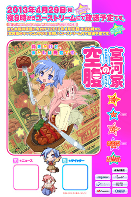The official website for the anime adaptation of Kagami Yoshimizu's Lucky Star spinoff manga Miyakawa-ke no Kūfuku (The Miyakawa Family's Hunger) announced the cast on Monday. Many of the lead roles are being voiced by new talent, but four Lucky Star cast members are also reprising their roles: