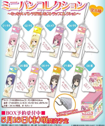 The online shop for the Animate retailer is currently accepting pre-orders for a box of eight different To Love-Ru -Trouble- Darkness-themed cellphone straps — that each come attached with a pair of mini underwear. Each of the straps feature an image of one of the manga and anime's female characters, and also comes with a 5 x 2.8-centimeter (about 2 x 1.1-inch) pair of white underwear made of cloth. Each mini-underwear includes a printed quote from the character. The characters featured on the straps are Momo, Yami, Mea, Lala, Haruna, Nana, Mikan, and Yui. Animate is selling the straps in sets of eight for 5,040 yen (US$54). The straps will ship on May 16.