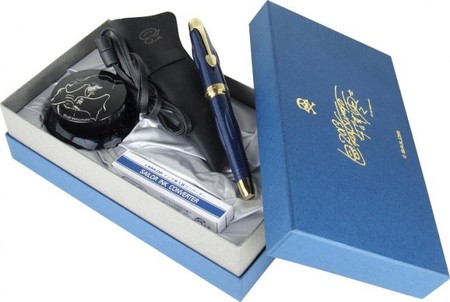 The pen is sold in a set with a holster-like pen sheath, an ink bottle etched with Captain Harlock on the lid, a converter, and a thank-you card featuring a drawing of Galaxy Express 999's Maetel.