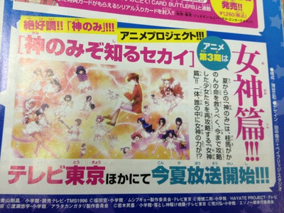 This year's 24th issue of Shogakukan's Weekly Shonen Sunday magazine confirmed on Wednesday that the third season of The World God Only Knows' (Kami Nomi zo Shiru Sekai) anime will cover the Goddesses arc in Tamiki Wakaki's original manga. The third season will premiere this summer.