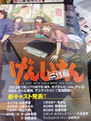 Previously announced cast members include Nozomi Yamamoto as Chika Ogiue, Sumire Uesaka as Rika Yoshitake, Ai Kakuma as female Kenjiro Hato, Kazutomi Yamamoto as male Kenjiro Hato, and Yumi Uchiyama as Mirei Yajima. Several of the cast members from the earlier Genshiken anime have been replaced.