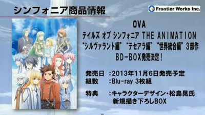 In addition, the company announced that a Blu-Ray box containing all episodes of the Tales of Symphonia the Animation, Tales of Symphonia the Animation: Tethe'alla Episode, and Tales of Symphonia the Animation: The United World Episode OAVs has been green-lit. The box will contain 3 Blu-ray discs, and have a new original cover art by OVA character designer Akira Matsushima. The set is scheduled to be released by Frontier Works on November 6.