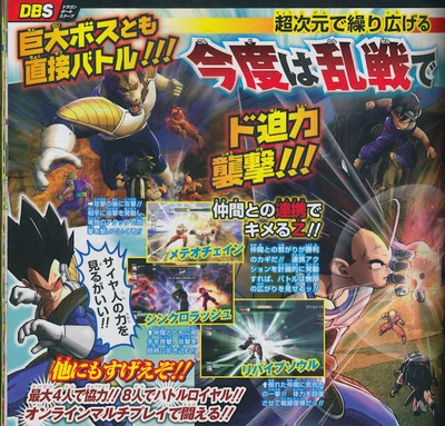 This year's 30th issue of Shueisha's Weekly Shonen Jump magazine is announcing on Monday that Namco Bandai Games is making Dragon Ball Z: Battle of Z, a team melee fighting action game for PlayStation 3, Xbox 360, and PlayStation Vita. Up to four players can play cooperatively, or eight players can engage in a massive battle royale. The game has online multiplayer support, and players can work together on attacks such as "Synchro Rush" or boosting each other's health via "Revive Soul."