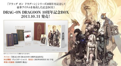 Square Enix will offer the game in a deluxe 10th Anniversary Box on October 31 for 19,800 yen (US$202). A standard edition will retail for 7,980 yen (US$82). The 10th Anniversary Box will include the Drag-On Dragoon World Inside production designs, a chip music CD, the "History Films" bonus video content on Blu-ray, a Drag-On Dragoon Novel Prelude, a postcard book, and a download content code.
