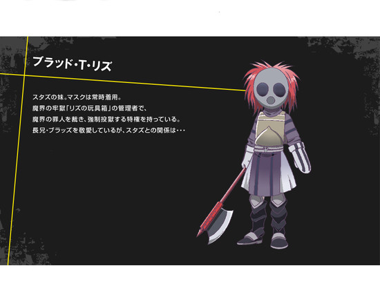 Yuuka Nanri (Wandering Son, Problem children are coming from another world, aren't they? ) plays Blood T. Liz, Staz's younger sister who always wears her mask. She is the warden of the netherworld's largest prison, “Liz's Toy Box”. Bloods has given her the privilege to judge criminals and throw them into jail. Although she loves her eldest brother Bloods, she absolutely despises Staz.