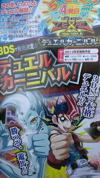 This year's September issue of Shueisha's V Jump magazine is revealing on Saturday that Konami is developing a new Yu-Gi-Oh! Zexal video game for the Nintendo 3DS handheld console titled Yu-Gi-Oh! Zexal Gekitotsu! Duel Carnival. The announcement for the game advertises it as the first classical duel simulator game for the Nintendo 3DS. The game is designed to provide a genuine dueling experience similar to the original Yu-Gi-Oh! trading card game.