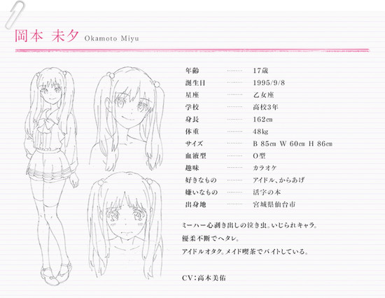 17-year-old third-year high school girl who is indecisive and prone to crying. She is an idol otaku who works part-time at a maid café