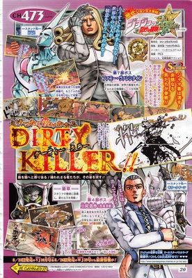 This year's 36th issue of Shueisha's Weekly Shonen Jump magazine is announcing on Monday that Namco Bandai Games' JoJo's Bizarre Adventure: All-Star Battle PlayStation 3 video game is adding more characters to its roster. Funny Valentine, the main antagonist from the Steel Ball Run arc and Yoshikage Kira (when he is disguised as Kōsaku Kawajiri) from the Diamond is Unbreakable arc are joining the roster.
