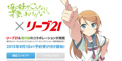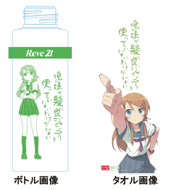 Japanese hair clinic Reve21 is now taking pre-orders for a shampoo and conditioner created in collaboration with the light novel and anime series Ore no Imōto ga Konnani Kawaii Wake ga Nai (Oreimo). The bottle design, which is still under development, will feature Kirino and the title "Ore no Imōto ga Kami ni Ii Shampoo wo Tsukatteinai Wake ga Nai" (My Little Sister Should Be Using Good Shampoo for Her Hair). The two 100ml bottles will ship for 3,500 yen (US$35) with an original towel (pictured with the bottle design to the right) and usage instructions this September.