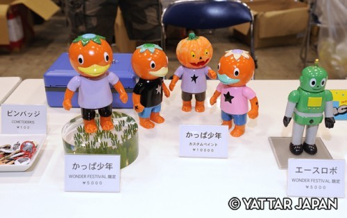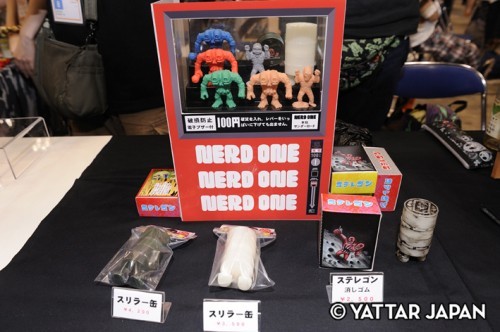 In the 1980s, rubber erasers shaped like the characters from Kinnikuman were all the rage with kids the world over. Now, a new trend to create original rubber figures is taking hold. Shamrock Arrow made rubber figures based on the 1970s wrestling superhero AsteKaizer. Booth mate Nerd One created original rubber creatures that come in a soft vinyl oil drum, combining two different mediums in an original way.