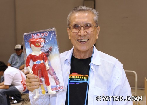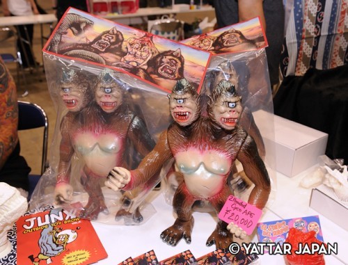 In the last decade, Japanese-made soft vinyl (sofubi) has become the medium of choice for independent figure designers to create both nostalgic and original figures. The colorful vinyl babies are by Warashi – an artist from Osaka who has started creating soft vinyl figures at his home instead of using a factory. Comet Debris makes cute kappa and robot figures reminiscent of old advertising mascots. Kaiju Ken and Kaiju Shojo make new versions of classic 70s superheroes. The giant two-headed gorilla figure is by MISHKA, the popular Brooklyn-based street fashion brand. Mr. Ishizuki, president of Bullmark – the company that started making soft vinyl version of Godzilla and Ultraman Kaiju way back in 1960s – is shown here with a new jumbo version of Red Man.