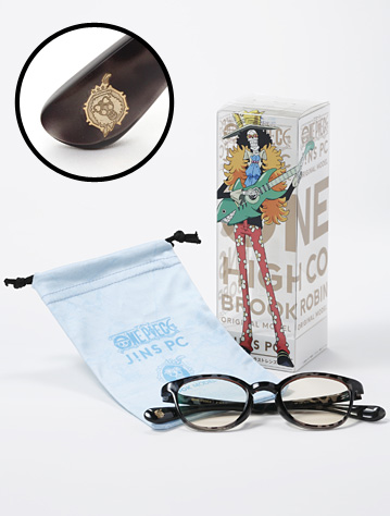 Each pair of eyeglasses comes with a soft carrying case printed with the One Piece logo and the character's name. The temple ends of the glasses are stamped with each character's symbol in gold print. Orders purchased from the JINS web store come with a "Gum-Gum Fruit" charm, while orders from the JINS Amazon and JINS Rakuten web stores come with a One Piece character charm.