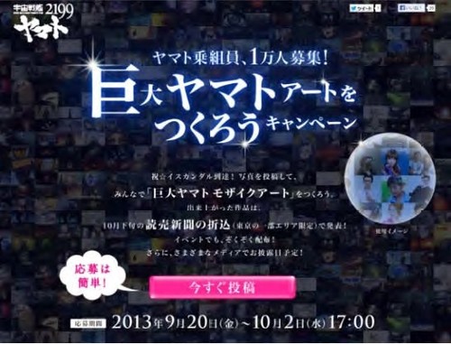 The "Let's Make Some Huge Yamato Artwork!" campaign started September 20 and seeks the help of fans to create a humungous mozaic art piece. Celebrating the Yamato's arrival at the far-off planet of Iscandar, this campaign will register 10,000 people as new Yamato "crew members." Each crew member is asked to upload a photo, be it of themselves, their family members, their pets, or whatever they want, though Yamato cosplay is encouraged. From these images, a giant Yamato will be constructed.